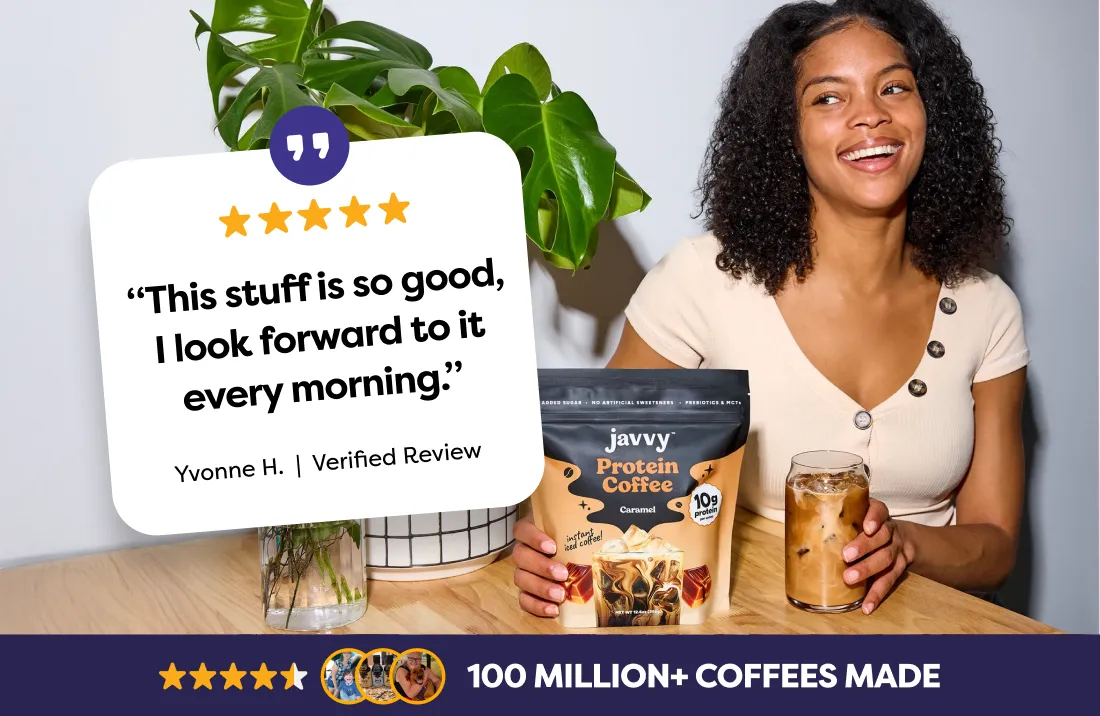 Javvy tastes great on its own – just like a freshly brewed black coffee, not a bland protein shake. Or customize it with your favorite milk and flavors.
