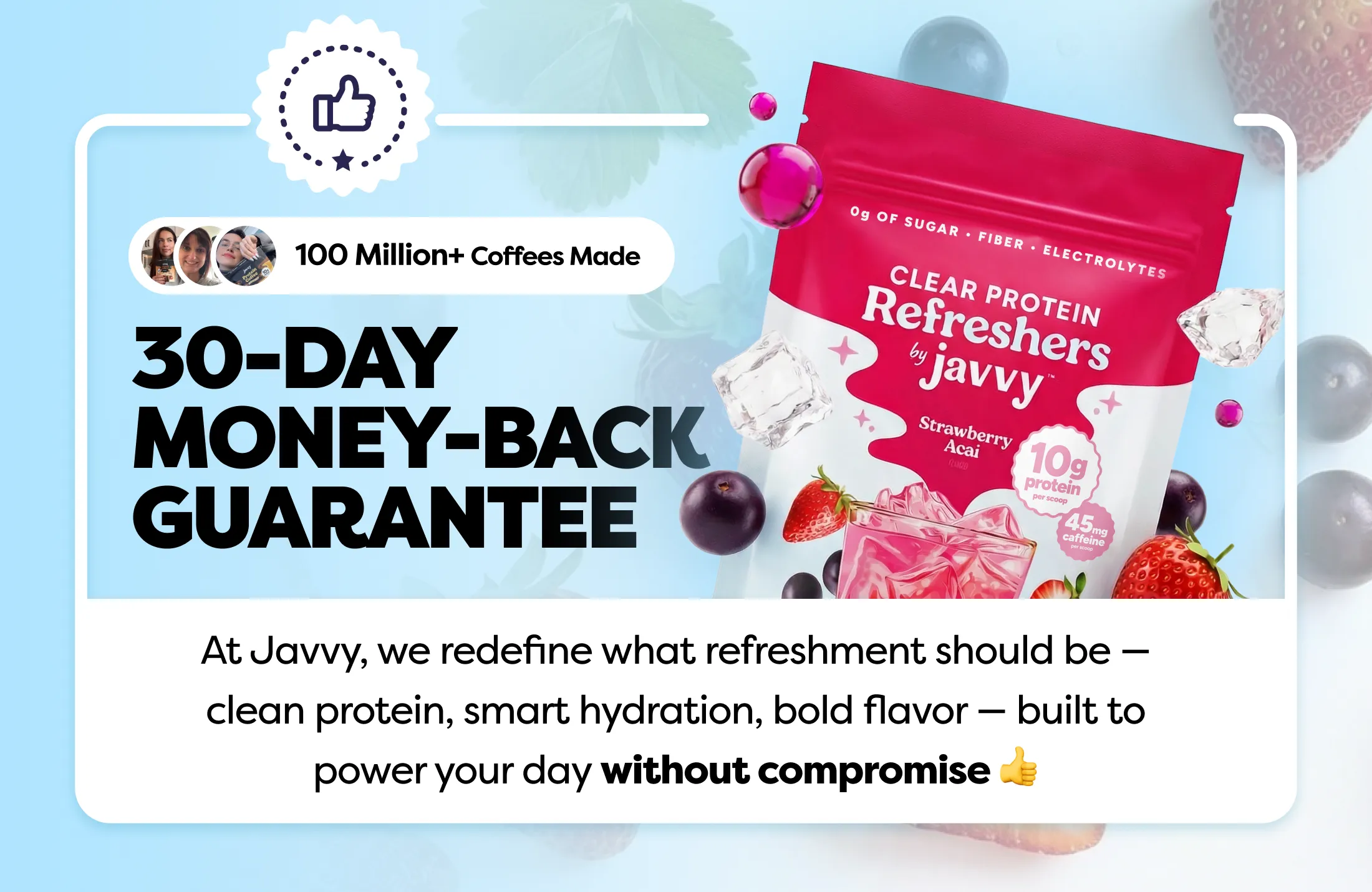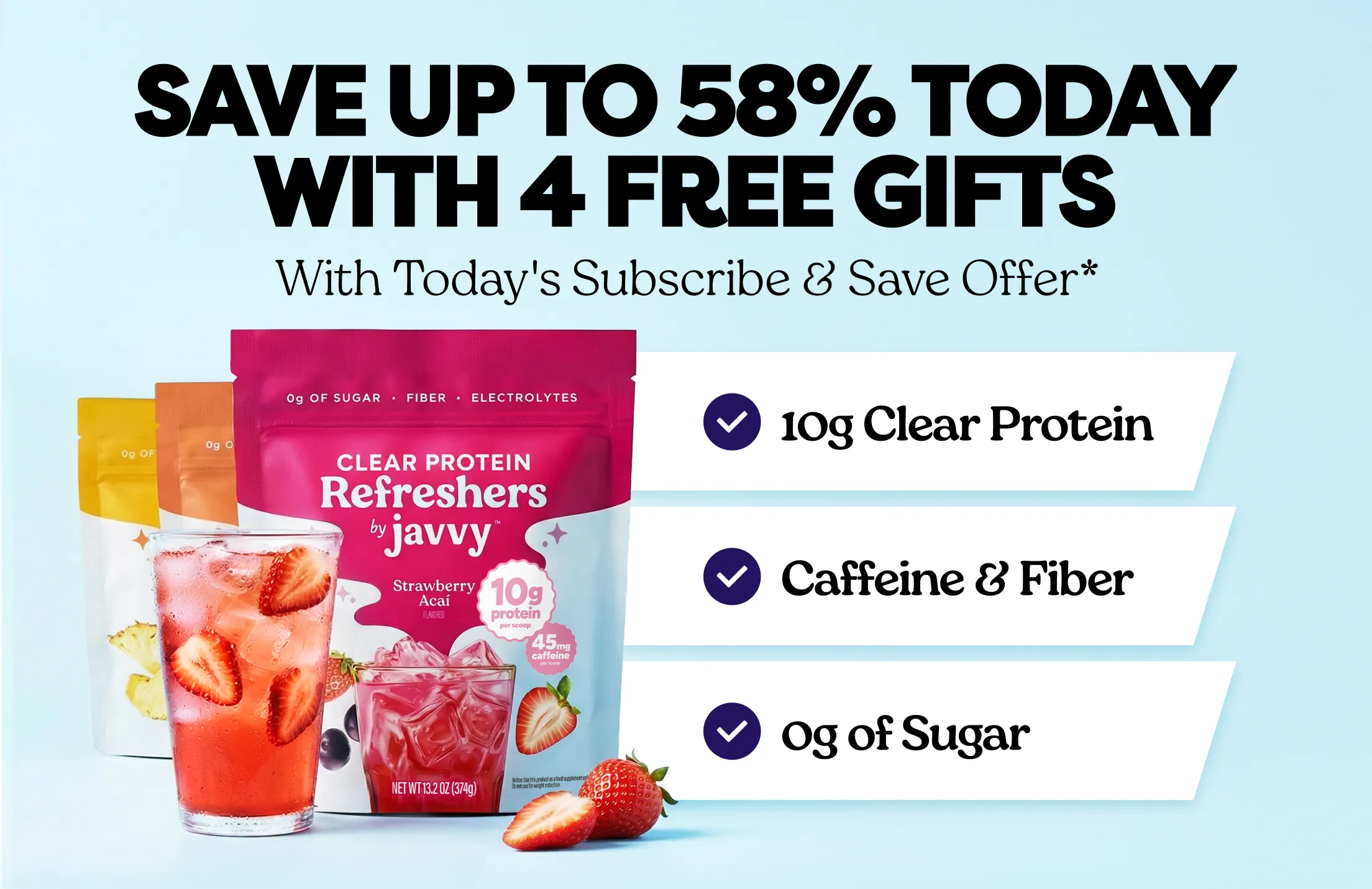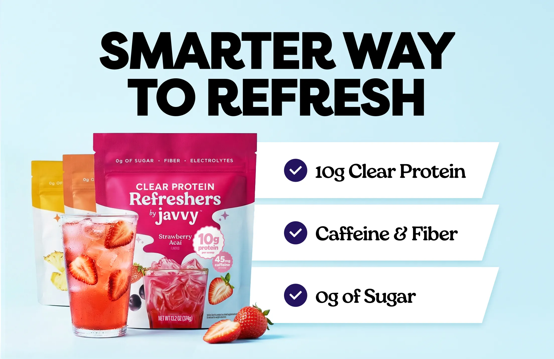 No more bland, boring beverages. Enjoy refreshing, fruity flavor with clear protein and 0g sugar — no compromises.