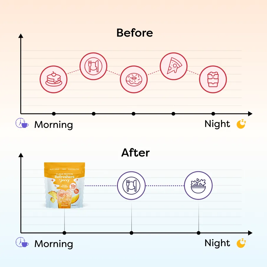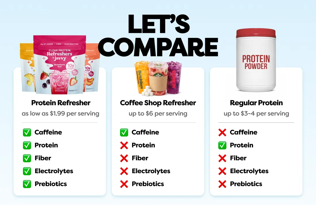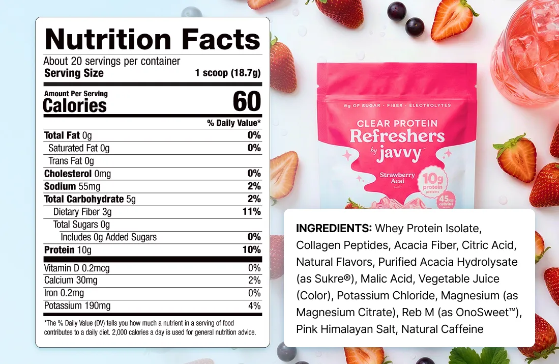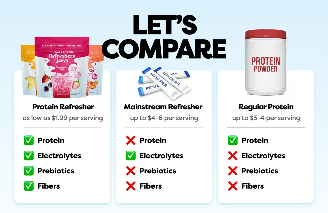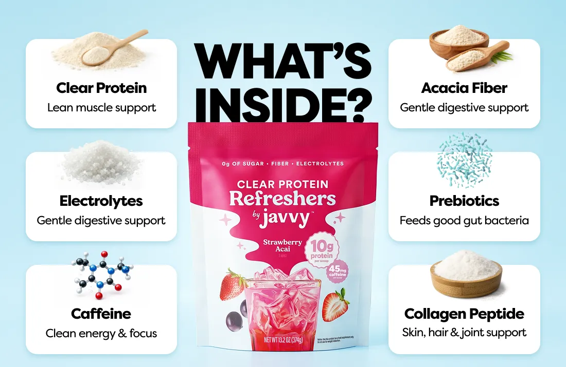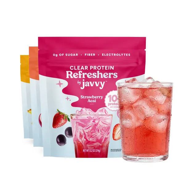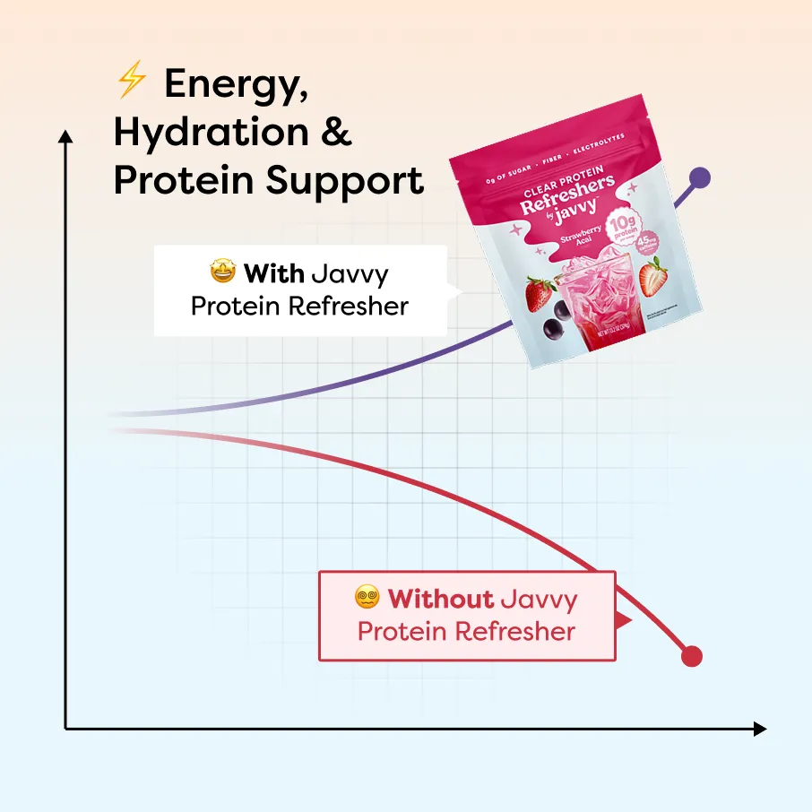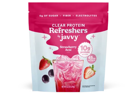 Formulated with electrolytes for hydration and 10g of clear protein, Javvy Protein Refresher helps you feel balanced, focused, and energized — without heaviness.