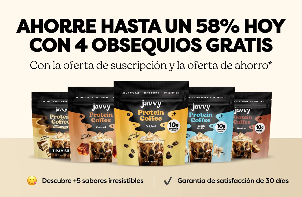 El café instantáneo de proteína Javy no contiene azúcares ni edulcorantes añadidos. Solo tiene azúcares naturales provenientes de ingredientes reales. Contiene menos de 1 gramo de azúcar natural, proveniente de la proteína de suero.